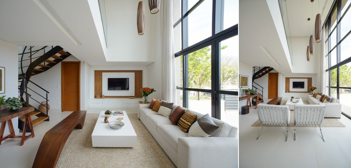 Ao subir um lance de escadas, o pé-direito duplo do living é o prenúncio de uma arquitetura de interiores aconchegante e marcada por uma paleta de tons claros.